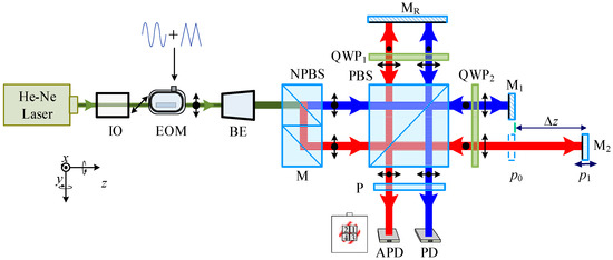 Configuration of DPMI: IO, isolator; EOM, electro-optic phase modulator; BE, beam expander; NPBS, non-polarization beam splitting cube; PBS, polarization beam splitting cube; MR, reference plane mirror; M1,2, fixed and moveable measuring plane mirrors; QWP, quarter-wave plate; P, polarizer; PD, photodetector; APD, integrated 2 × 2 array photodetector.