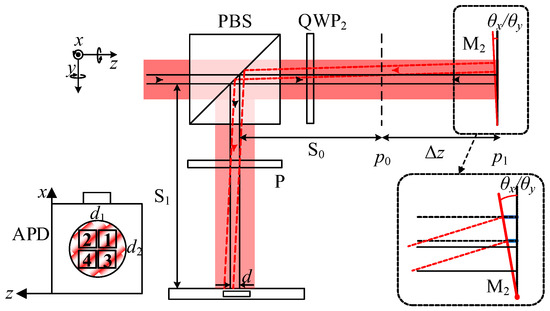 To compensate for the rotation error, the DWS technology with APD was adopted. As shown in Figure 2, when M2 tilts with the measured object, the direction of the returned measuring beam changes. Since the reference beam direction does not change, the OPDs between the reference and measuring beams on each detector of APD become unequal. Using this OPD unbalance and the geometric relationship between the direction of the measuring beam and the rotational angle of M2, the yaw angle θx and the pitch angle θy can be derived as