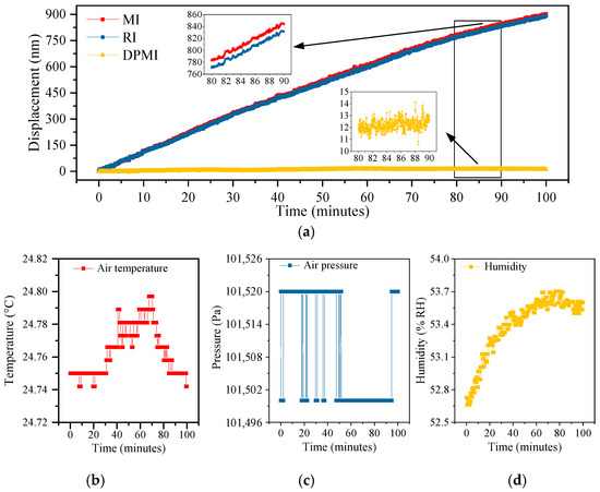 In this experiment, M1 and M2 were fixed at the same distance from PBS to minimize other uncontrollable influences on the measurement results. The experiment lasted for 100 min; during the experiment, the two interferometers MI and RI recorded the displacement simultaneously. The experimental results are shown in Figure 4. In Figure 4a, the red line and blue line represent the measurement results of MI and RI, respectively. The yellow line is the measurement results of DPMI obtained by the difference between the measurement results of MI and RI. The measurement results of MI and RI drift with the environmental change such as the changes in air temperature, air pressure, and humidity, as shown in Figure 4b,c, during 100 min. The maximum measurement drifts in MI and RI were, respectively, 902.9 nm and 892.1 nm during the experiment. Additionally, in the subplots, the changes in measured displacement by MI and RI were, respectively, 61.1 nm and 60.7 nm between 80 and 90 min. However, the trends in the measurements of MI and RI were in good agreement. Due to the good consistency, there was no significant change trend in the measurements of DPMI. The maximum measurement drift of DPMI was 16.3 nm during the experiment, and the change in measured displacement by DPMI was 3.6 nm between 80 and 90 min, respectively. The experimental results verified that the designed DPMI can effectively reduce the influence of environmental disturbance.