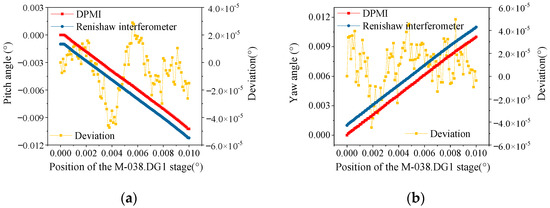 According to Equation (7), the distances d1 and d2 are critical parameters for angle measurement. Therefore, they need to be calibrated before angle measurement. Calibration was performed using the angle measurement result of the Renishaw interferometer, and the final calibration value of d1 was 1.750 mm, and d2 was 1.910 mm. In this angle measurement experiment, the measuring mirror M2 of DPMI and the measuring reflector of the Renishaw interferometer were mounted back to back on an M-038.DG1 stage. As the inherent rotation angle of most linear stages is within 0.01°, the M-038.DG1 stage drove the two measuring reflectors to rotate from 0° to 0.01° with a step increment of 0.0001°, and the rotational angle was measured simultaneously via DPMI and Renishaw interferometer. The experiment was performed twice, and the stage was placed vertically to generate pitch motion and was placed horizontally to generate yaw motion.