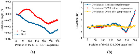 In this displacement measurement experiment, the measuring mirror M2 of DPMI and the measuring reflector of the Renishaw interferometer were mounted back to back on the M531.DD1 stage. After the setup was constructed, the displacement compensation parameters in Equation (8) were obtained. The distances S0 and S1 were 236 mm and 195mm, respectively, and the distances Hx and Hy were 90 mm and 12 mm. During the experiment, the M531.DD1 stage drove the two measuring reflectors to move from 0 mm to 300 mm, with a step increment of 2 mm, simultaneously measuring the displacement and rotation angle via DPMI and the displacement via the Renishaw interferometer, for comparison.