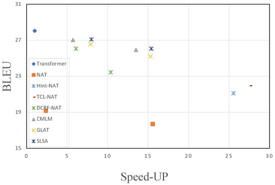 To show the speedup of our model, we present a scatter plot in Figure 2. From Figure 2, we can see that the speedup of the SLSA is consistent with the NAT and GLAT. This is because the decoding process of these models is exactly the same. Compared with the other models, with the same speedup, only the performance of the CMLM and transformer were better than our model. In addition, we can see that reranking with the NPD would significantly increase the decoding latency. Therefore, improving the NAT model without the NPD is worth exploring.