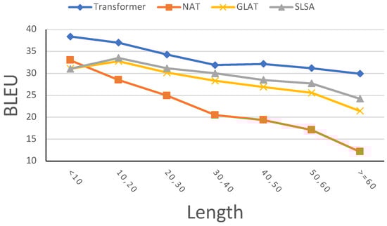 From the results, we can see that as the length increased, the difficulty of translation also increased, and the accuracies of all models decreased. Among them, the accuracy of the vanilla NAT model dropped quickly. In contrast, although the accuracies of GLAT and SLSA also showed a downward trend, they still remained relatively stable. In addition, the SLSA achieved better results under different lengths compared to the GLAT, which demonstrates the effectiveness of our proposed method. What should also be noticed is that when the length was less than 10, the vanilla NAT model achieved better results. We think the reason is that when the length is less than 10, the operation of glancing cannot perform well as on a sentence length greater than 10.