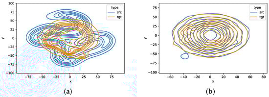 Bivariate kernel density estimation plots of representations. (a) The representations output by GLAT; (b) The representations output by SLSA. Source representation is denoted by a blue line, and the target is in orange. This figure shows that our model effectively pulled the source and target sentence-level semantic representations closer together.