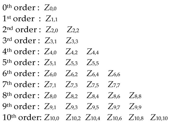 - Papakostas, G.A.; Boutalis, Y.S.; Karras, D.A.; Mertzios, B.G. Modified factorial-free direct methods for Zernike and Pseudo-Zernike moment computation. IEEE Trans. Instrum. Meas. 2009, 58, 2121–2131. [Google Scholar] [CrossRef]