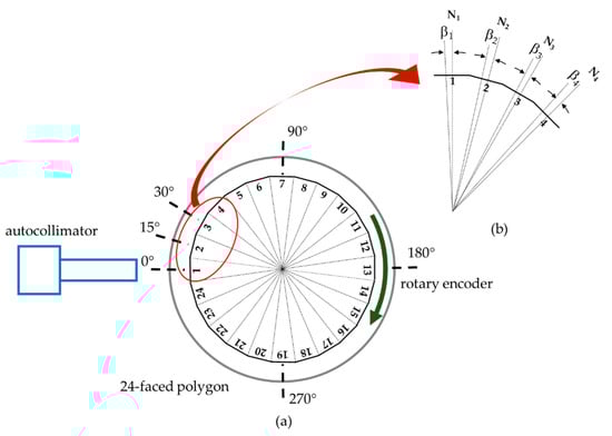 Figure 1a shows a schematic of the calibration setup. An autocollimator is placed in front of a rotary encoder. A 24-faced polygon is mounted at the center of the rotary encoder. The 24-faced polygon is used in this study to illustrate the related theory and to conduct experiments [15]. A polygon with any number of faces can be used in practice. The polygon has 24 reflecting faces as the measuring faces. The autocollimator is aligned and collimated to reflect the faces of the polygon.