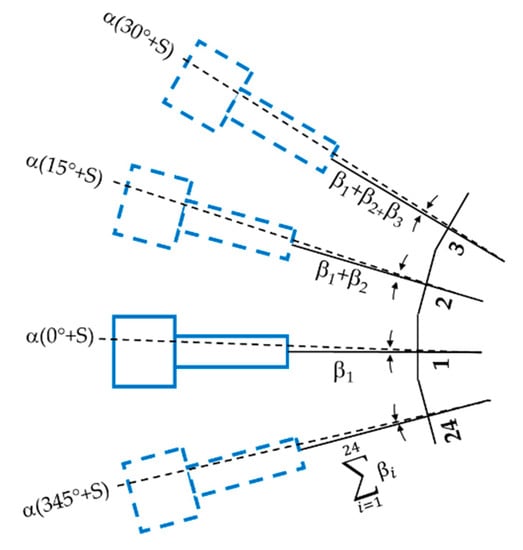 In the ideal polygon, the measuring faces are the same as the nominal faces. The measuring face (R) and the nominal face (N) are slightly tilted with respect to each other, as indicated in Figure 1b. For the 24-faced polygon, it is assumed that one full circle is divided into 24 nominal faces. The angle interval between two consecutive nominal faces is 15°, which is called the nominal pitch angle. The pitch angle deviation βi is the difference between the angle values of two adjacent measuring faces and the nominal pitch angle of 15°. Each measuring face has a different pitch angle deviation. Therefore, in our case, the 24-faced polygon exhibits 24 angle deviations. According to the circle closure principle, the summation of all the angle deviations must be zero.