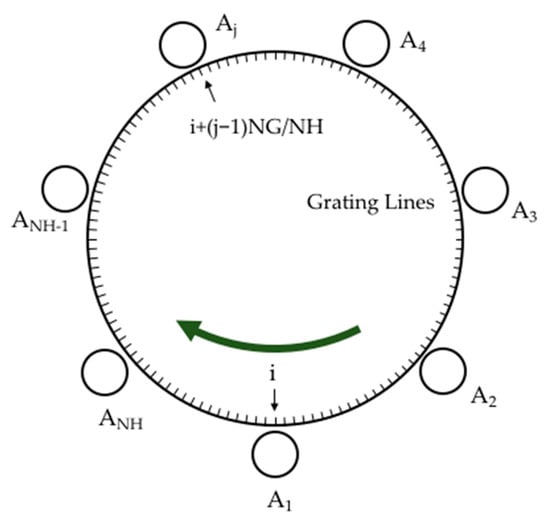 Self-calibration for calibrating the rotary encoder is used to verify the utility of the shift-angle method. The theory behind self-calibration of the SelfA rotary encoder was described in the literature [8,9,10,11]; here, we present only a brief review. Self-calibration is used to analyze the angular deviation from the angle values of multiple sensors located at equal angular intervals around the same rotary encoder. Figure 3 shows a schematic of the NH units of the sensor heads. Aj is the sensor head label, and j is the number of each sensor head. NG is the number of grating lines in the rotary encoder. All the sensor heads receive the angle value simultaneously during rotation. The received angle represents the angular deviation, which represents the difference from the ideal angle value at a specific grating line. ai denotes the angular deviation at the grating number i. During rotation, the first sensor head A1 receives the grating number i, and the jth sensor head Aj receives the grating number i + (j − 1)NG/NH. However, the angular deviation ai cannot be measured directly. The measured angular value between sensor head A1 and sensor head Aj can be expressed as follows: