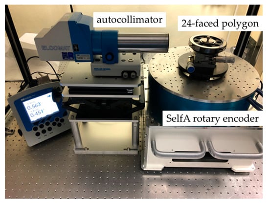 Figure 4 shows a photograph of the experimental setup. The working environment is stabilized in which the temperature is 20 ± 1 °C and relative humidity is 45 ± 10%. The 24-faced polygon is mounted at the center of the SelfA rotary encoder (e-motionsystem, Inc., Shinagawa City, Japan, SCMS-127). The SelfA rotary encoder is equipped with 12 head sensors and a rotary encoder, which has 36,000 graduation lines at intervals of 36°. The SelfA rotary encoder is controlled by a servo motor with an air bearing. The autocollimator (MOLLER-WEDEL OPTICAL GmbH, ELCOMAT 3000) is fixed outside the SelfA rotary encoder and aligned to the polygon.