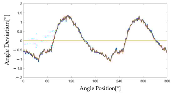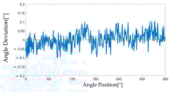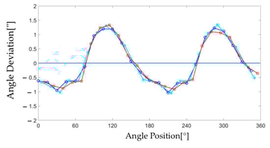 The first term on the left-hand side of the equation denotes the measured values. According to Equation (2), the first term on the right-hand side of this equation must be zero. The second term on the right-hand side can be determined from Table 2. Consequently, setup error U1 is calculated. Therefore, using Equation (3), the angle errors, from α (0° + S), α (15° + S), …, α (345° + S) in steps of 15°, can be calculated.