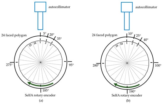 As depicted in Figure 8a, the shift-angle is 5°. As the starting face, the first face is located at 5° of the SelfA rotary encoder. The SelfA rotary encoder is rotated in 23 steps. The angle positions are 5°, 20°, …, 350° in steps of 15°. The second row of Table 1 lists the measured values containing the angle errors, the pitch angle deviations, and the setup error. The pitch angle deviations are calculated in the previous measurement, where S is 0°. The setup error U can be calculated using Equation (7). Therefore, the angle errors, corresponding to 5°, 20°, …, 350° in steps of 15°, can be calculated, as illustrated in Figure 7. According to Figure 8b, the shift-angle S is 10°. As the starting face, the first face is located at 10° of the SelfA rotary encoder. The SelfA rotary encoder rotates in 23 steps. The angle positions are 10°, 35°, …, 355° in steps of 15°. SelfA angle errors, from 10°, 35°, …, 355° in steps of 15°, are calculated by following the same calculation procedure, as illustrated in Figure 7.
