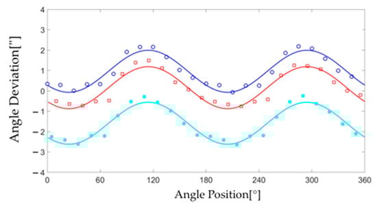 To check the setup error U, another method uses the curve fitting least square method. The angle error can be expressed as a Fourier series because the angle error is a periodic function in one rotation. The first term on the right-hand side of Equation (9) averages the measured angular value by the two heads. The curve fitting function can be expressed as the second periodic function as α(θ) = A*sin(2*θ + B) + U(fitting), as illustrated in Figure 9. For a shift-angle S of 0°, the measured values are fitted as A = 1.0314″, B = −2.4233, and U0(fitting) is 0.9596″. For a shift-angle S of 5°, the A and B values are fixed to check the setup error U5(fitting). The U5(fitting) value is −1.5927″. For the shift-angle S 10°, the U10 (fitting) value is 1.1545″ using the same procedure. As shown in Equation (7), the setup error U0 is 0.9596″, U5 is −1.5927″, and U10 is 0.1545″. The difference in the setup error is less 10−4″using two different methods, Equation (7) and curve fitting.