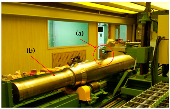 In current practice, ultrasonic inspection of work rolls is performed by applying the local water immersion method using a resolution-type immersion transducer (Olympus, Seoul, Korea, 10 MHz, 0.25″). Figure 1 shows the typical ultrasonic inspection system for work rolls employed in industrial sites.