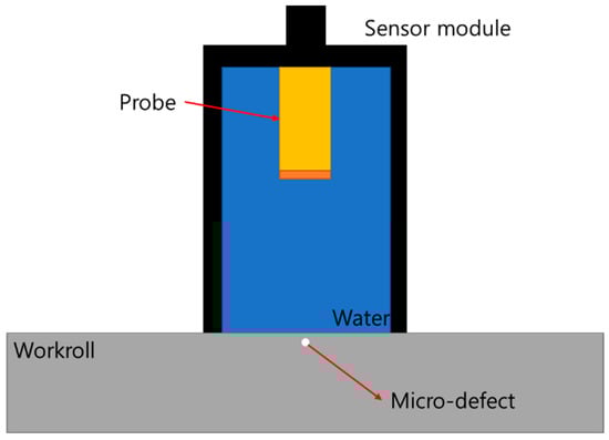 In the actual site, the minimum defect size that can be detected by ultrasonic inspection of the work rolls is 0.4 mm, and the ultrasonic signals are amplified to detect the micro-defects. As the gain of the ultrasonic pulser receiver increases, the signals from the work roll surface generated at the interface between the water and the work roll overlap with the defect signal generated immediately below the surface. Figure 2 presents a schematic illustration of the inspection of a work roll.