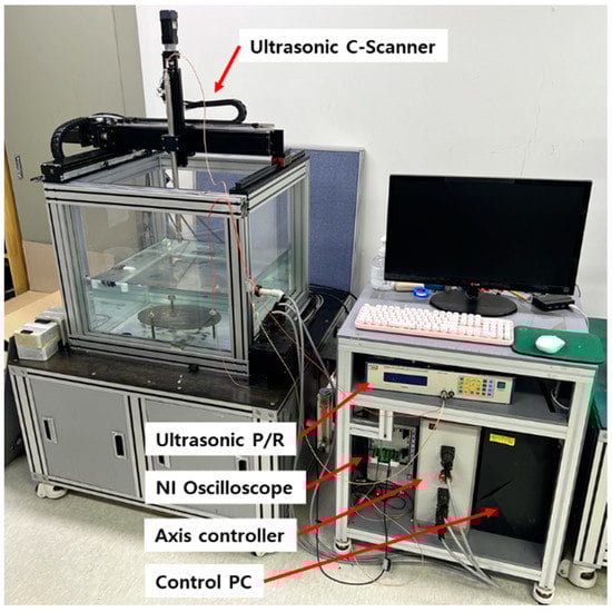 The signals from the subsurface defects were acquired using the standard specimen, and the sensor module of the ultrasonic inspection system for the work rolls was modeled with an ultrasonic C-scanner, as shown in Figure 4. Figure 4 shows a photograph of the ultrasonic C-scanner used in the experiments.