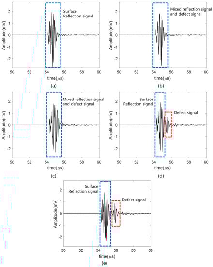Second, the data were augmented by simulating the time-axis shifting of the ultrasonic signals. For ultrasonic signals, the time axis of the defect reflection signals may shift owing to the influence of the experimental settings and equipment. Based on the existing signal data, the number of data was increased by shifting the time axis by 0.5–1.5 μs, and the total number of data increased sixfold from 1400 to 8400. Figure 6 shows the ultrasonic signals of the augmented data, and Table 2 shows the composition of the augmented database based on the original database.