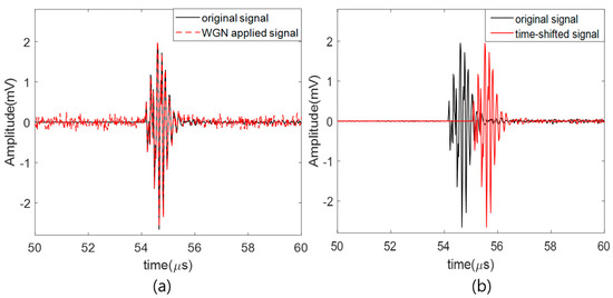 Augmented ultrasonic signal: (a) applied WGN with SNR, (b) time shifting.