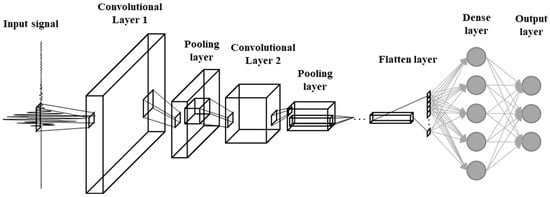 The CNN is a class of ANN proposed by Le Cun et al. [23] and follows the design concept and model architecture of the neocognitron [24] while adopting the backpropagation algorithm for learning; it is currently the most commonly applied ANN. The CNN can be divided into one part for extracting the features of the input data and another part for classifying these features. The feature extraction part is divided into the convolutional and pooling layers. In the convolutional layer, the main operation is a convolution, and the pooling layer provides spatial transformation invariance via a pooling operation. The convolutional and pooling layers correspond to the simple and complex cell layers of the neocognitron, respectively, and the convolutional layer is an essential element for introducing an activation function after applying a filter to the input data. The pooling layer of the neural network performs subsampling of the input data to reduce the computational load and prevent overfitting; however, as it increases the complexity, its use can be selected depending on the problem. For classification, a flatten layer is located in the middle, through which the data are transformed into an array connection to a fully connected layer. With the CNN, a pattern can be learned in one location and determined in another location, which is possible by sharing the same parameters in the filter [13,25,26,27]. Figure 7 shows the architecture of the CNN described above.