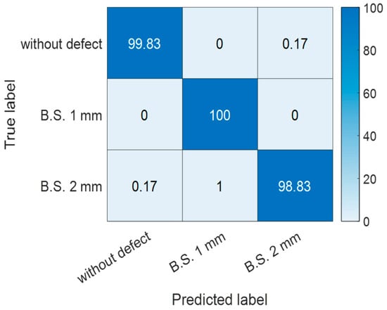 The probability of accurately classifying a signal without defects was 99.83%, and the probability of incorrect classification as defect at 2 mm below the surface was 0.17%. Correct classification was performed for defects that were 1 mm below the surface; the probability of incorrect classification of the defects at 2 mm below the surface as defects at 1 mm below the surface was 1%, and the probably of correct classification of the defects at 2 mm below the surface was 98.83%. In most cases, it is confirmed that the prediction performance for defect classification was almost accurate.