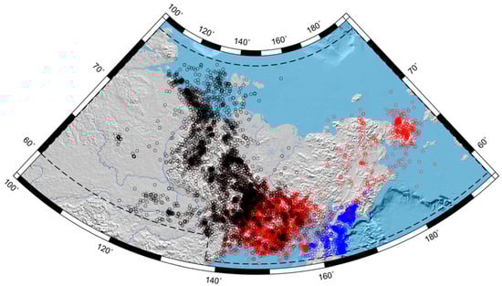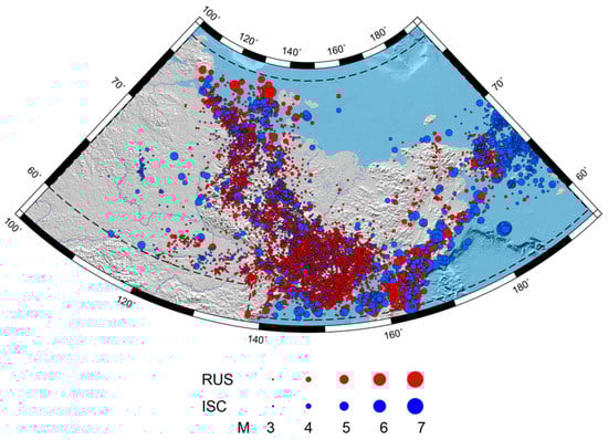 Nowadays, the seismic monitoring of the Russian Arctic is carried out by regional branches of the Geophysical Survey of the Russian Academy of Sciences (GS RAS) (http://www.gsras.ru/new/eng/catalog/, (accessed on 20 March 2022)). In the Eastern part of the Russian Arctic, this work is carried out by the Yakutsk, Magadan, and, partially, the Kamchatka Branches of the GS RAS. In addition, detailed information on earthquakes can be found in the global catalog of the International Seismological Center (ISC) (http://www.isc.ac.uk/isc-ehb/search/catalogue/, (accessed on 20 March 2022)), which combines the data from several global and national seismological networks. It has to be noted that a comparative analysis of the catalogs showed that for the Eastern Sector of the Russian Arctic, the ISC catalog does not contain many events that are presented in the regional catalogs of the GS RAS. This is explained, among other things, by the fact that the survey reports bulletins to the ISC for events starting at a certain magnitude threshold. For this reason, the information on low-magnitude seismicity is mainly contained in regional catalogs.