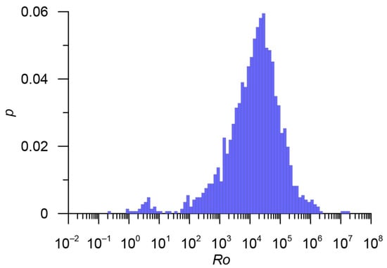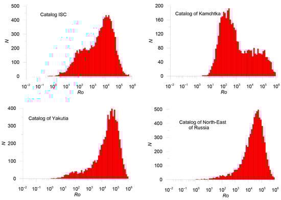 Before proceeding with the merging process of the four catalogs, we checked each of them for internal duplicates. For this reason, we built the distribution of metric (1) for the nearest events within each catalog (Figure 2). The analysis was performed with the metric parameters min and km. As a result of the analysis, no events with the same time and epicenter coordinates were found in any of the four catalogs. For such events, Ro = 0, and, thereafter, we will call them absolute duplicates. Statistical analysis also did not reveal anomalous groups of nearest events. The duplicates are characterized by the value Ro < 10. The value Ro = 10 corresponds to a distance of 150 km or a time interval of 0.5 min. From our experience, we know that duplicates have smaller differences in instrumental catalogs, and the number of such nearest events within each of the catalogs is very small. These are mainly the early aftershocks of the Olyutorsk earthquake, with M = 7.6, on 20 April 2006, and the Ilin-Tas earthquake, with M = 6.6, on 14 February 2013. There is no reason to consider such events as duplicates since the early aftershocks can occur at very small distances and time intervals. Thus, the necessary condition for applying the method in [] is met.