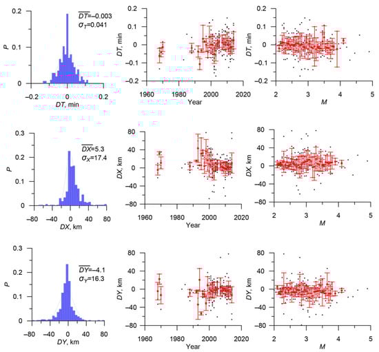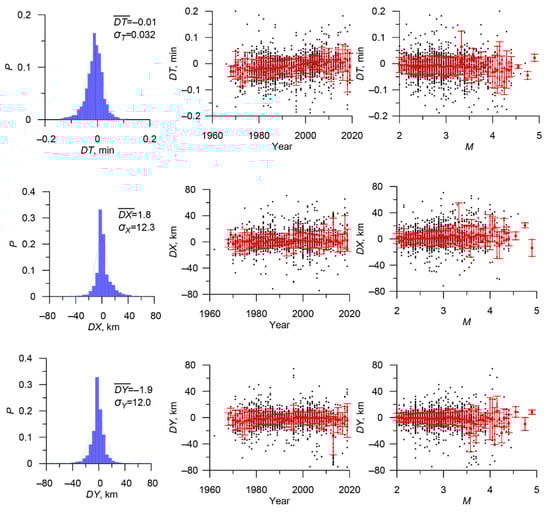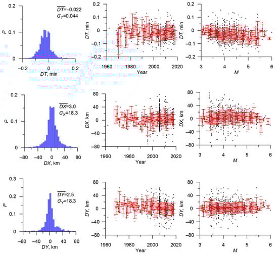 Distributions of DT, DX, and DY for the nearest events from the RUS and ISC_Other catalogs, and the dependence of the standard deviations , , and and the mean values on the time and magnitude of the events. The red dots and bars are the population mean values and standard deviations, respectively.