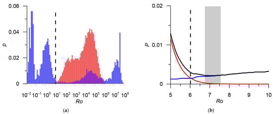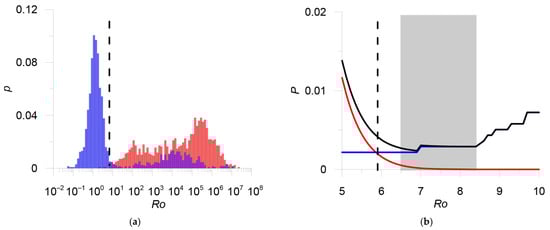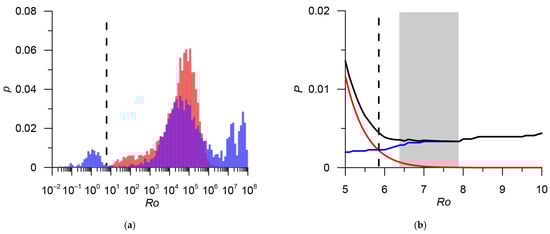 (a) Comparison of the metric distribution for RUS/ISC_Other pairs (blue histogram) and the same metric for RUS/RUS earthquakes (red histogram). (b) Threshold optimization: the red line is the probability of missing a duplicate in the model with metric (1), the blue line is the probability of a false duplicate, the black line is the total probability of errors of the first and second kind, the dashed line Ro = 6.0 corresponds to an equal number of errors of the first and second kind (number of false duplicates is equal to the number of missed duplicates), the estimate of the total number of errors is approximately 0.3%, and the gray bar shows the range of values for the metric Ro = 6.7 ÷ 7.6, minimizing the total number of errors (approximately 0.2%).
