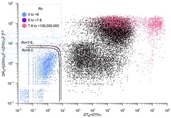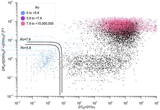Distribution of normalized DT and DR, and metric level lines (1). The colored dots are the RUS/ISC_Other pairs and the black dots are the distances between the RUS/RUS events in metric (1). The metric levels Ro = 6 and Ro = 7.6 are shown by the black lines, and absolute duplicates are not shown.