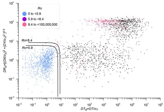 Distribution of normalized DT and DR and metric level lines (1). The colored dots are the CORE/RUS_ISC pairs and the black dots are the distances between the CORE/CORE events in metric (1). The metric levels Ro = 5.9 and Ro = 8.4 are shown by lines.