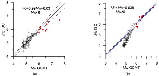 Correlation ratios of GCMT and ISC magnitudes: (a) MWGCMT and mbISC for MW < 6.0 and (b) MWGCMT and MSISC for MW ≥ 6.0. The dashed lines show 95% confidence intervals. The events with an MW of ≥6.0 are highlighted in red.