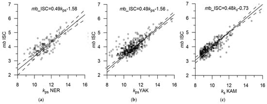 Correlation ratios of the energy classes KPS and KS and the magnitude mbISC. (a) Northeast, KPS; (b) Yakutia, KPS; and (c) Kamchatka, KS. The dashed lines show 95% confidence intervals.