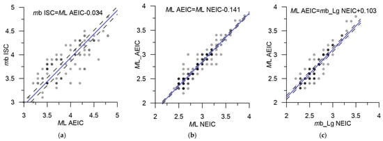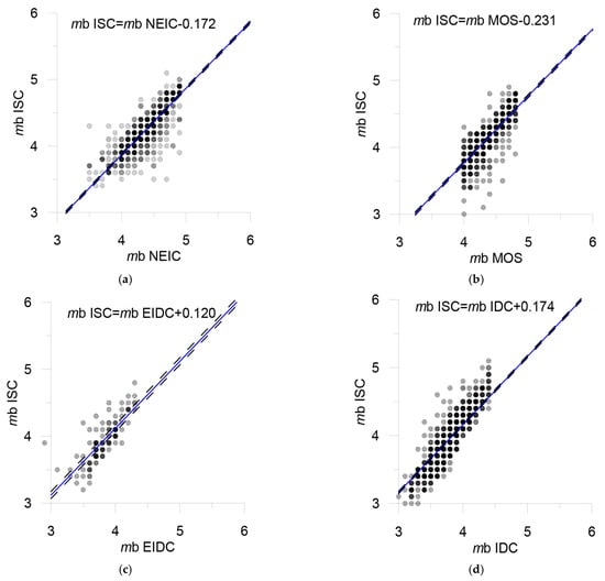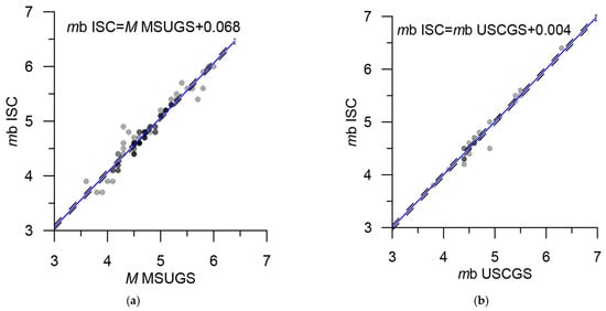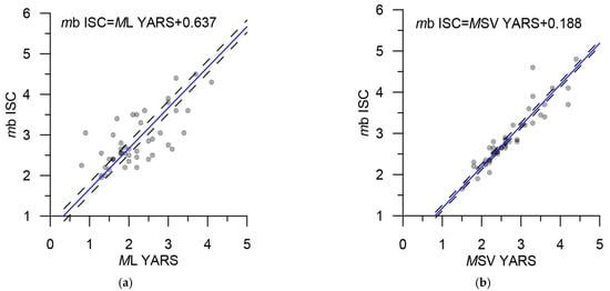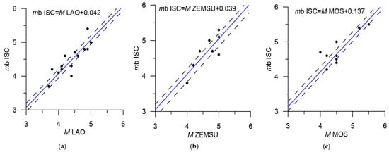 It is necessary to notice that about 7% of the events in the integrated catalog have other types of magnitudes. If an event has several magnitudes, then preference was given to those for which it is possible to construct a correlation with magnitude mbISC. In few cases, when there were no pairs to determine direct correlations to mbISC, we used indirect correlations with other magnitudes, and we consider these correlations unreliable (indicated in the “Note” column of Table 4). The 95% confidence intervals are constructed by the Grapher Golden Software built-in tool (https://www.goldensoftware.com/products/grapher, (accessed on 20 March 2022)).