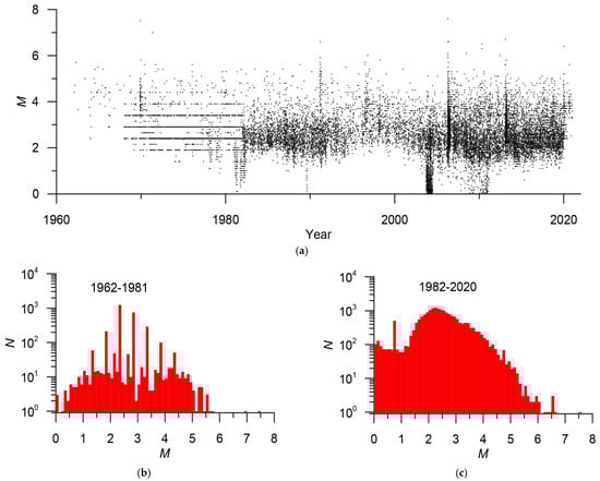 (a) Distribution of the magnitude of events in time. (b,c) Magnitude–frequency graphs before 1982 (b) and after 1982 (c). Before 1982, the energy classes were integers, and so the magnitudes are in increments of 0.5.