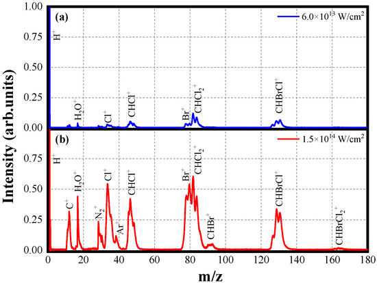 TOF mass spectrum of CHBrCl2 molecules with the laser intensities of (a) 6.0 × 1013 (blue solid line) and (b) 1.5 × 1014 W/cm2 (red solid line), respectively.