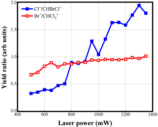 The ions’ yield ratio of Cl+/CHBrCl+ (blue solid block dotted line) and Br+/CHCl2+ (red hollow block dotted line) versus laser power.
