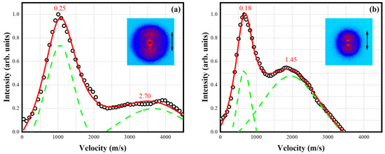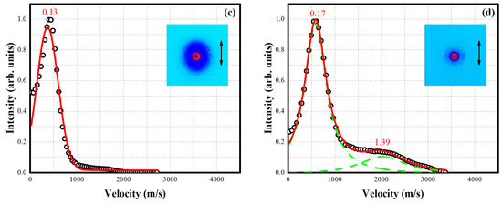 The velocity distributions of ions (a) Cl+, (b) Br+, (c) CHBrCl+, and (d) CHCl2+. The black circles are experimental data. The green dashed lines are the fitting peaks, and the red solid lines are simulated results with multipeak Gaussian functions. The insert figure is the sliced images of the relevant fragment ions at the intensity of 1.5 × 1014 W/cm2, where the black double-headed arrow represents the laser polarization direction.