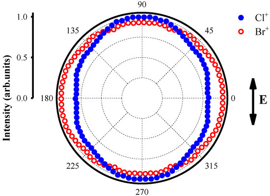 The angular distribution of the ions Cl+ (blue solid circle) and Br+ (red hollow circle) in the lower laser intensity, where the double arrow represents the laser polarization direction.