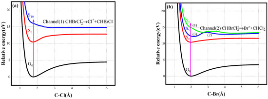 To better illustrate the ionization and dissociation processes of the CHBrCl2 molecule, the related theoretical calculations were performed with GAUSSIAN 16 [20], and the relaxed force constant was obtained with the COMPLIANCE software package [21]. The geometry optimization of the reactants, transition states, and fragments was carried out at the B3LYP level with a 6-31G* basis set [22]. Vibrational frequencies and relaxed force constants of each optimized structure were computed to ensure that the energies of stable structures and transition states were the local minimum and maximum along the reaction coordinate, respectively, and the unscaled harmonic frequencies were used to obtain the zero-point energy at the G4 level [23]. The potential energy surfaces of the excited state were carried out at the B3LYP level with the cc-pVTZ basis set [24]. The ionization potential was 10.94 eV for the CHBrCl2 molecule, which was close to the 10.96 eV [25]. The good agreement between our calculations and previous experiment results can demonstrate the feasibility of the theoretical methodology used in this paper.