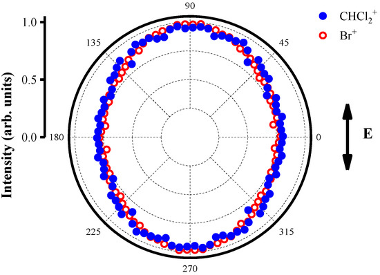 The angular distributions of fragment ions further confirm the CE process. The angular distributions of ions Br+ and CHCl2+ are shown in Figure 6. They have the same angular distribution, which validates that the above dissociation channel (3) belongs to the CE process, along with the C-Br bond.