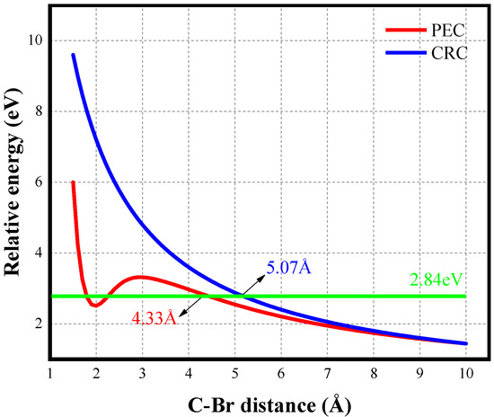 In the classic CE model, the total KERs of one CE channel are expressed as Equation (5), where r indicates the internuclear distance in Å. Once the total KERs are measured, the critical distance (Rc) of the CE channel can be determined. According to our experimental results, the CE of CHBrCl22+ started at Rc = 5.07 Å. The Rc is far longer than the equilibrium internuclear distance (Re = 1.95 Å), which is caused by the internal Coulomb force stretching the nuclear distance. For polyatomic molecular ion CHBrCl22+ involved in CE processes, is it appropriate to use Coulomb repulsion forces between two atoms? Can the real potential energy relationship of molecules changing along the chemical bond determine the release of kinetic energy? To answer these questions, we calculated the potential energy curves of the multi-charged molecular ion CHBrCl22+ along with the C-Br bond at the B3LYP/6-31G* level. The Coulomb repulsive curve also has been shown in Figure 7. Here, the energy in 10 Å on the potential energy curve (PEC) was equal to that of the Coulomb repulsive curve (CRC) for convenience [26].