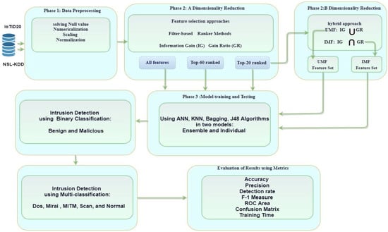 The Internet of Things (IoT) consists of particular limitations such as connectivity limitation, computational capacity, and energy budget []. These peculiar characteristics makes it significantly different from other continuous environments. The data are created from a wide range of sources such as different sensors and other types of internet-connected devices. It is usually expressed as multimodal or heterogeneous. IoT data are basically big data because of their volume, velocity, variety, and veracity []. Herein, we are obliged to overcome these issues. The basic steps involve three main phases, including (i) data preprocessing, (ii) dimensionality reduction (feature selection) with proposing the hybrid feature selection approach (improving the choice of relevant features), and (iii) ensemble ML algorithms (model training), as shown in Figure 1. Data typically must be refined in the early stage before being used to train the system, especially when starting with a dataset built from a heterogeneous IoT ecosystem. Initially, data preprocessing is performed to prepare the data in a proper format for the learning phase by applying several consecutive preprocessing operations over the dataset such as data scaling, data conversion, removing unwanted/invalid data, and fixing missing values. Our model has been embedded into the ensemble framework, as shown in Figure 1, to provide more consistent and reproducible results in such a dynamic environment. The main phases are detailed in the following subsections.