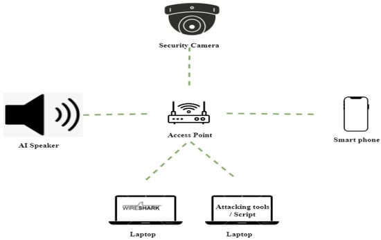 We have conducted the experiment using the IoTID20 [] and the NSL-KDD [] datasets to evaluate the performance of the hybrid feature selection approach. The IoTID20 dataset consists of various types of IoT attacks (i.e., DDoS, DoS, Mirai, ARP Spoofing, etc.) as well as normal (benign traffic). The IoTID20 dataset was collected from the IoT ecosystem of a smart home. The smart home was designed to incorporate multiple interconnected components including AI Speakers (SKTNGU), Wi-Fi cameras (EZVIZ), laptops, smartphones, tablets, a wireless access point (Wi-Fi), and a Wi-Fi router. The cameras and AI speakers were represented as the IoT victim equipment, and the other equipment were represented as the attacking devices. The testbed has been implemented to simulate different actual attacks in the IoT ecosystem using the Network Mapper (Nmap) tool. Figure 2 represents the testbed environment where the IoTID20 dataset [] was generated and collected. Figure 3 shows a taxonomy of the dataset and the number of instances for each target of the dataset. The IoTID20 dataset has 86 features and contains 625,784 instances.