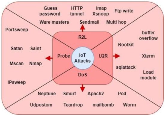 Significant and fruitful efforts have endeavored to address the security concerns of recent years for the IoT ecosystem. Several new IoT security technologies were established by pairing artificial intelligence techniques and cybersecurity virtues. Several promising state-of-the-art studies have been conducted for IoT security using machine learning (ML) and deep learning (DL) techniques [,,,,,,,,,]. However, only a few were developed by investigating the impact of using different feature selection approaches to improve prediction and classification accuracy. For instance, Albulayhi et al. [] have proposed and implemented a new minimized redundancy discriminative feature selection (MRD-FS) technique to resolve the issue of redundant features. The discriminating features have been selected based on two criteria, i.e., representativeness and redundancy. Their model was evaluated utilizing the BoT-IoT dataset. Ambusaidi et al. [] presented a flexible, mutual information-based feature selection technique (FMIFS) that chooses the best features to enhance the classification algorithm. The proposed model was evaluated using three datasets (NSL-KDD, KDD Cup 99, and Kyoto 2006). The Least Square Support Vector Machine-based IDS (LSSVM-IDS) was used to measure performance. Ambusaidi et al. [] showed 99.79% accuracy, 99.46% detection rate (DR), and 0.13% FPR over the KDD99 dataset. However, their employed datasets are not up-to-date (date back to 2009, 1999, and 2006 for NSL-KDD, KDD-Cup99, and Kyoto datasets, respectively) and do not fully represent the IoT cyberattacks.