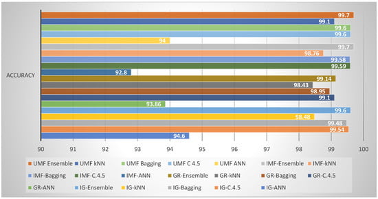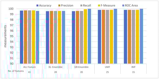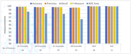 Based on the obtained results of these experiments summarized in the tables and figures above, accuracy performance increased via reducing feature dimensionality using IMF-Ensemble and UMF-Ensemble as compared to using only the classification via the IG or GR approach. Furthermore, independent (individual) classifiers achieved better classification accuracy using optimum top-ranked features (IMF, UMF) compared to features selection obtained by the IG and GR approaches. For instance, the Bagging classifier achieved the highest accuracy (%99.91) by using the UMF approach (28 optimum top-ranked features) compared to the various numbers of selected features. In the ANN classifier, the accuracy classification fluctuates up and down by applying various feature selection approaches. There is a noticeable increase in the accuracy performance of the ensemble classifier when compared to individual classifiers. In terms of selected features, a small number of relevant features are not required to achieve the higher accuracy whereas many relevant features do not assure that a lower classification accuracy will result.