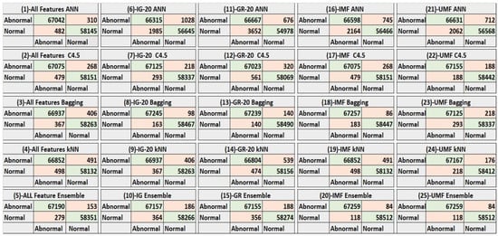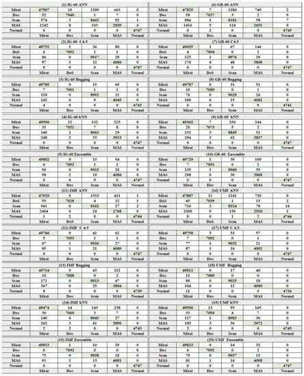 In phase 2A in Figure 1, we demonstrate feature selection via IG, GR, and filter-based ranking methods. The output of phase 2A is the extraction of two sets of features: top 60 and top 20. These two feature sets are generated independently, i.e., feature ranking from the top 60 is not carried over to the top 20. In phase 2B in Figure 1, we demonstrate the hybrid approach by implementing the intersection and union set theory rules. These rules are labeled IMF and UMF, respectively, for the intersection and union operations. The IMF and UMF rules are described by Equations (5)–(8). The hybrid approach is a manual process to produce IMF and UMF approaches (11 and 28 features from the IoTID20 dataset, and 15 and 25 features from the NSL-KDD dataset) from the top 20 ranked feature set produced by Phase 2A. Phases 2A and 2B together produce six different feature selection sets, which are: top 60 (via IG), top 60 (via GR), top 20 (via IG), top 20 (via GR), 11 IMF and 28 UMF. Due to the use of both traditional and hybrid feature selection approaches, we can, to increase the efficiency of our feature selection process, reduce the computational costs of the learning process (i.e., training and testing workflows). Corresponding features for each of the six feature sets are listed in Table 2. Also, Table 3 shows the results of ranking features from the NSL-KDD dataset.