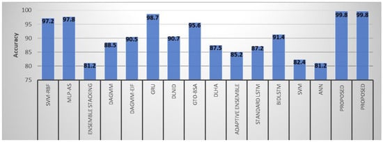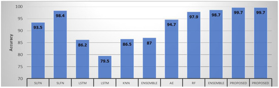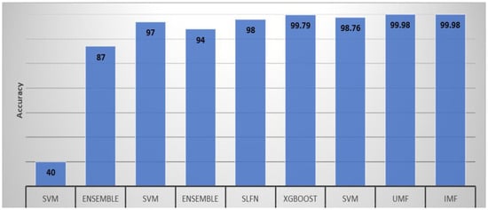 Based on the obtained results from the IoTID20 dataset, the proposed UMF and IMF results in the improvement of Anomaly-based IDS for accuracy, precision, recall, f1-measure, ROC area of 99.98, 99.90, 99.90, 99.90, 99.90, respectively. The improvement in the performance of IMF-ensemble or UMF-ensemble is because IMF and UMF filter-based approaches use an optimum (min, max) number of top-ranked features relevant for classification. UMF and IMF do not show any fluctuation in the performance since UMF, and IMF incorporates the best features produced by both IG and GR approaches. Furthermore, the model with UMF and IMF is not prone to underfitting when the number of features decrease. According to the results shown in Table 13, the proposed model is superior and competent in comparison to the results stated for models reported in [,,,] using IoTId20 dataset. Furthermore, we used the NSL-KDD dataset for validating our binary classification detection model.  Table 14 indicates that the proposed model is superior and competent in comparison to the results stated for the models reported in [,,,,,,,,,,,]. Figure 13, along with Table 15 represent a comparison between our multi classification model performance versus the related works with respect to the IoTID20 dataset. Finally, while our proposed study evaluates the anticipated predictive models using diverse evaluation metrics, some related works failed to evaluate all metrics since they did not consider the choice of different features. Indeed, access to the best features with a minimum of features is extremely important to improve accuracy and conserve resources and reduce training time complexity.