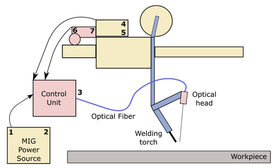 The main sensor of the system is based on plasma optical spectroscopy and is complemented with traditional sensors to monitor the electrical, mechanical or environmental parameters of the process. Figure 1 is a scheme of the monitoring system, including the plasma optical spectroscopy-based system, as well as the welding voltage and current (closed loop Hall effect), wire feed speed (encoder-based, 800 pulses per revolution), protection gas flow rate (with temperature compensation), welding speed and position (encoder-based, 800 pulses per revolution) and ambient temperature and humidity sensors. The welding process has been illustrated in Figure 2.