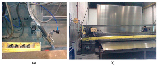Images of the MIG welding process of Al-Mg alloy sheets. (a) Detail of the welding torch and the optical fiber used during the trials. (b) Preparation of the sheets before the welding process.