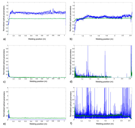 Output monitoring profiles for Weld Trials #1 and #2 using different spectroscopic parameters. Plasma RMS signal (thick blue line) and color temperature (thin green line) associated with (a) Trial #1 and (b) Trial #2. Ratio of H I line (656 nm) to Al I line (396 nm) (thick blue line) and 670 nm (thin green line) associated with (c) Trial #1 and (d) Trial #2. Ratio of Na I line (589 nm) to Al I line (396 nm) (thick blue line) and 670 nm (thin green line) associated with (e) Trial #1 and (f) Trial #2.