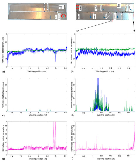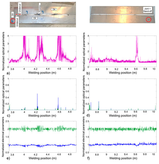 It is also interesting to analyse the performance of the electric sensors involved, i.e., those that acquire welding voltage and current information. In general terms, it might be concluded that, at least with respect to the studies performed in this work, these sensors exhibit a poorer performance than the optical plasma spectroscopy approach. Figure 6 shows the results of two weld trials in which the electrical signals showed some correlation with quality-related events. For example, Figure 6e presents the welding voltage and current profiles for Weld Trial #4, where oil was used at the top of the joint to simulate a lack of cleanliness. A visual inspection of the seam (Figure 6, top-left) clearly revealed the effects of the oil during the process. Specifically, the Ar I profile depicted in Figure 6a exhibited a trend with a good correlation with the visual defects to be found in the seam. Both the welding voltage and current also exhibited some perturbations matching these events (Figure 6e).